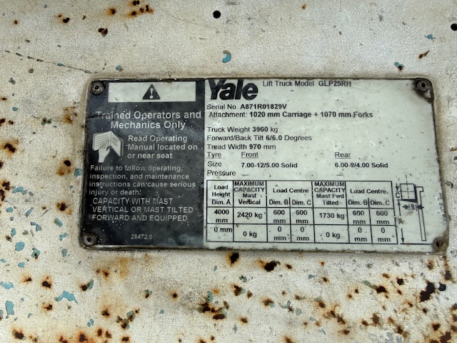 Yale GLP25RH forklift with 12,000 hours. (2.5T’er) LPG with solid tyres. LPG bottle not included. Good goer for $6,500 plus GST.